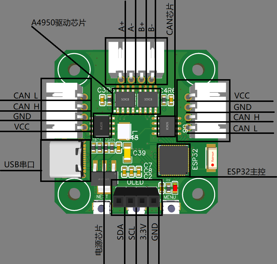 This project uses ESP32 as the main control, which can be controlled by UART, CAN, WIFI, and Bluetooth. The working voltage is 8-35V, and 14-bit magnetic encoder is used for closed-loop control.